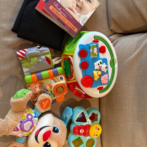 Fisher-Price babyleker sett i plast, flerfarget. Pakken inneholder ulike aktivitetsleker for små barn, blant annet elektroniske aktivitetsleker med knapper og lys, stabelringer, myk kosebamse med markerte kroppsdeler, samt mindre håndholdte leker og en myk stoffbok. Lekene er laget i hovedsak av plast og tekstil, i sterke farger som blå, rød, gul, grønn og oransje. Egnet som aktivitetsleker for baby og småbarn til lek på gulv eller leketeppe.
