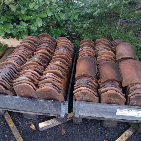 Tegl ferdig på pall. Har ca 600stk. 16krstk + mva. Ligger på pall. Jeg kan løfte på med traktor. Har også andre glaserte tegl, og andre flate uglasserte tegl. Kom og se.