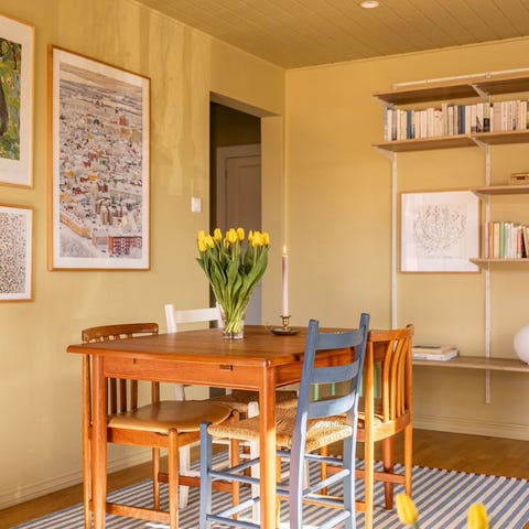 Bordet har et tidløst, skandinavisk design med slanke, skråstilte ben.