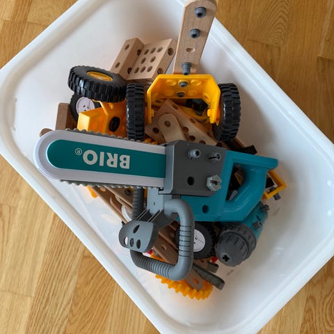 Brio byggesett med forskjellige deler, skruer, muttere og verktøy. Helt sikkert ikke komplett, men de aller fleste delene er med.