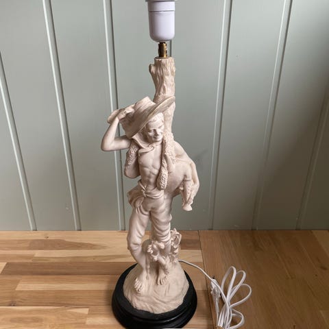 Svært vakker porselenslampe som forestiller en hvilende gjeter. Lampen har fine detaljer og en blank, elegant overflate som gir et klassisk og dekorativt uttrykk.