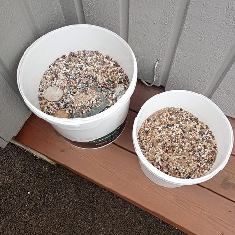3.5 bøtter med akvariegrus. Bøtter følger med. Det er hull i bunnen av bøttene for drenering. Brukt i fiskedam. Fiskedam med fontenepumpe selges også. Kommer egen annonse for den. Sender ikke