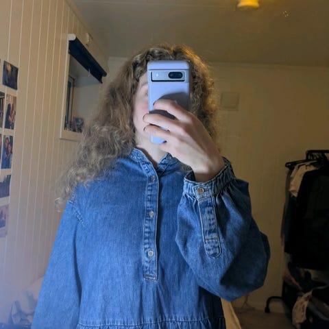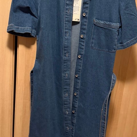 M.I.H Jeans hverdagskjole for dame i størrelse M. Kjolen er i blå bomull og har skjortekrage, lange ermer og knepping hele veien ned foran. Den leveres med avtakbart knytebelte i samme stoff for regulering i midjen. Materialet er vevd denim i bomull. Passer som hverdagskjole eller til enkle, uformelle anledninger.