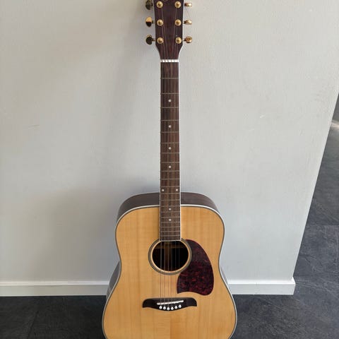 Vintage Washburn akustisk gitar med cutaway. Ca 30 år gammel. Kropp og hals har høyglans svart finish med lys binding langs kantene. Gitaren har stålstrenger, rosentre-lignende gripebrett med markeringer og krom stemmeskruer. Cutaway-utformingen gir lettere tilgang til de høyere båndene. Egner seg til allsidig akustisk spilling, både komp og fingerspill. Mangler en bit av lakken på kassa , har vært slik siden ny ,kun kosmetisk. Gitaren er lite brukt og har gamle strenger . Kan prøves på stedet , også med amp. ( Sender ikke )