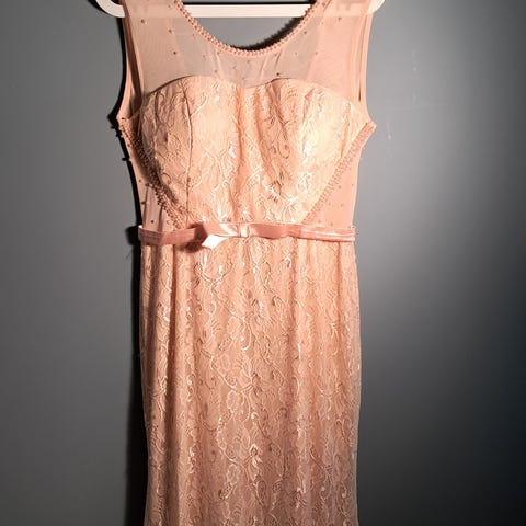 Selger en veldig pen og feminin blondekjole i en delikat pudderrosa/lys rosa farge. Kjolen har 3/4 lange ermer og nydelige "eyelash lace"-detaljer (små frynser) langs halsen, nederst på ermene og ved skjørtekanten.