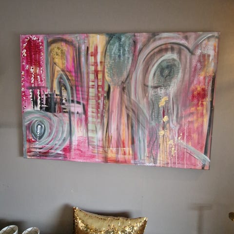 Abstrakt maleri malt intuitivt i klare farger med gull innslag...🎨Energisk og fargerikt...Passer inn i flere interiør stiler🌈bør sees..120×80 cm