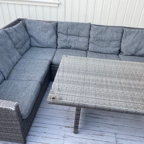 Fin hjørnesofa I to deler samt bord med glassplate, gode puter medfølger