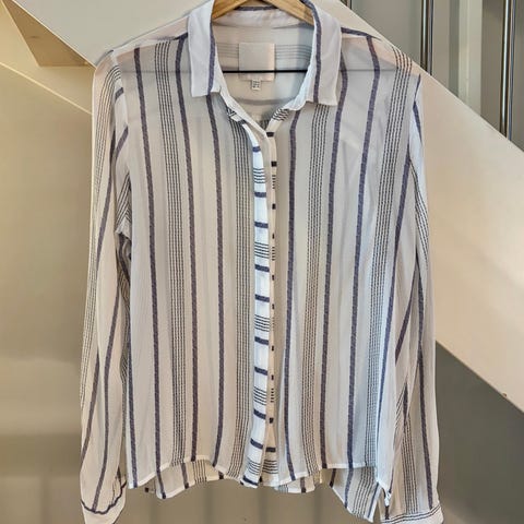 Luftig og fin skjorte i 100% lin fra H&M. Striper i hvitt og dus grønt. Veldig fin og behagelig skjorte, men fargene kler ikke meg dessverre. Cropped modell med knyting foran. Lite og pent brukt.