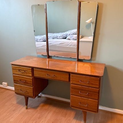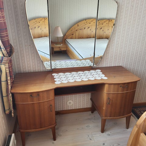 Gammelt sminkekommode i teak fra 60-tallet. 3 delt speil som om kan slåers inn.