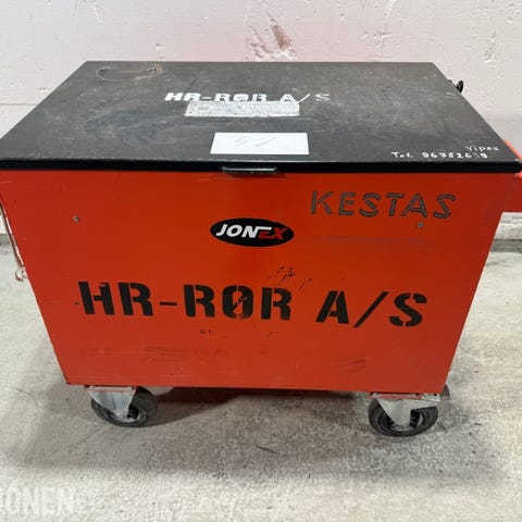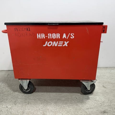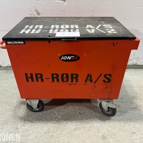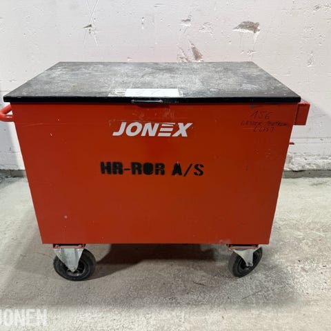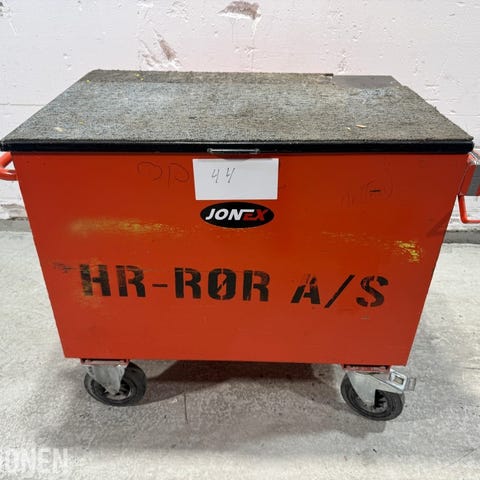 Mobilt verktøytralle fra Jonex med solid toppplate og påmontert skrustikke. Trallen er utstyrt med hjul for enkel forflytning og har lokk med låsemekanisme.