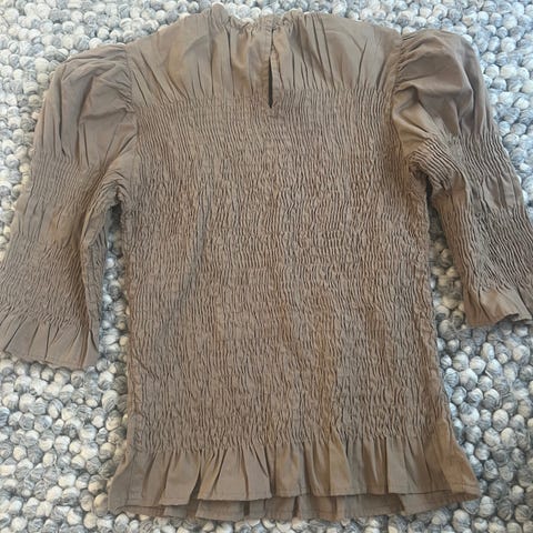 Bluse kort modell for dame i størrelse S. Blusen er rustbrun i fargen, har lange ermer med lett puff og mansjett, samt dyp v-utringning. Modellen er cropped med bred linning nederst og knappelukking foran. Fint brukt ca 2 ganger, selges fordi jeg ikke bruker den nok.