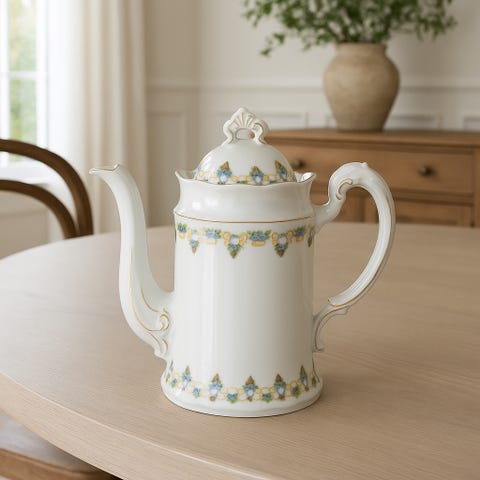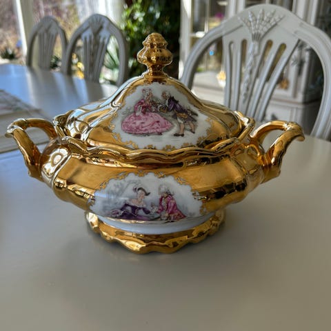 Suppe terrin med lokk i porselen. Terrinen er i lys/hvit grunnfarge med forgylte hanker og dekorative gullmønstre. Rundt på terrinen er det flerfargede motiv med romantiske scener. Lokket har matchende dekor og en toppknott. Egner seg som serveringsbolle eller som dekorativt innslag på bord eller i vitrineskap.