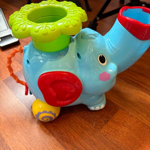 Fisher-Price aktivitetsleke elefant med ballbane i flere farger. Leken består av en stor elefantfigur med skål og renne der barnet kan slippe ned små figurer eller baller. Basen har tre ben for stabilitet, og det følger med en liten sneglefigur i plast som kan brukes sammen med banen. Leken har innebygd høyttaler og batteriluke, noe som tyder på lydfunksjoner. Egnet som gulvleke for små barn til å trene hånd-øye-koordinasjon og utforske årsak–virkning gjennom å slippe leker gjennom elefantens åpning og se dem rulle ned banen.