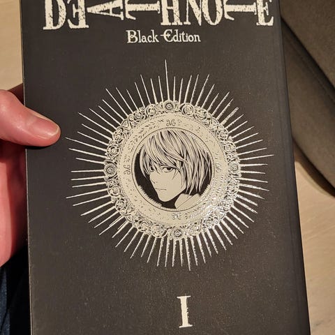 Death Note Black Edition manga bind 3. Inneholder volum 1 til 6 av serien, hvor 1-2 er sammen, 3-4 er sammen og 5-6 er sammen.