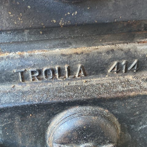 Trolla 820 vedovn i støpejern i svart utførelse. Ovnen har dekorert front med to dører. Modellbetegnelsen 820 er støpt inn i ovnen.