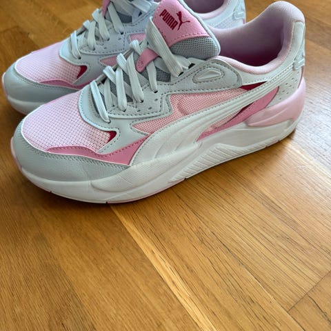 Puma joggesko i størrelse 38. Modellen er i hovedsak rosa og hvit med innslag av lysegrå detaljer. Overdelen består av en kombinasjon av tekstilmesh og syntetiske materialer, med snøring foran for justerbar passform. Skoene har polstret pløse og hælkappe for økt komfort, samt tekstilfôr på innsiden. Yttersålen er i gummi med mønster for bedre grep. Egner seg som hverdagssko eller til lett aktivitet.