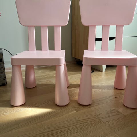 En liten, solid plaststol i lyserosa – perfekt for barn. God stand med vanlig bruksslitasje, lett å tørke av og flytte rundt. Selges kr 50,-, må hentes på Persaunet i Trondheim.