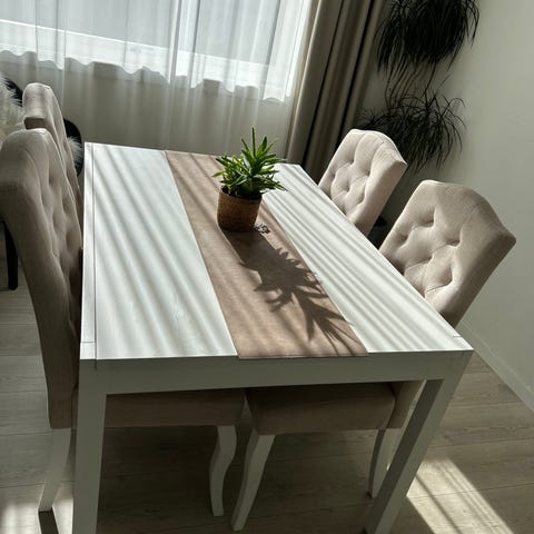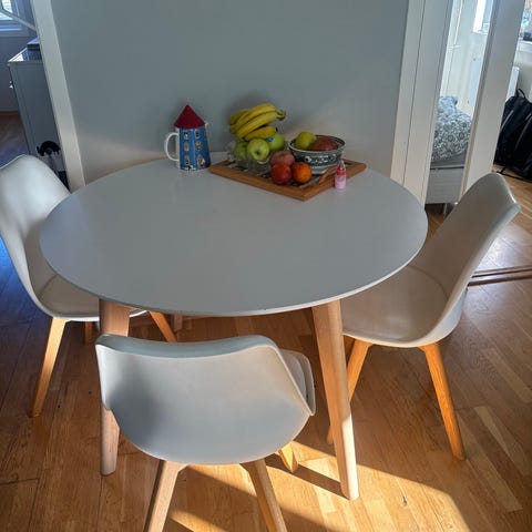 I forbindelse med flytting ønsker jeg å selge spisebordet og to stoler som føler med! De er brukt men i god stand! Noen riper i bordet, men lite synlig!
