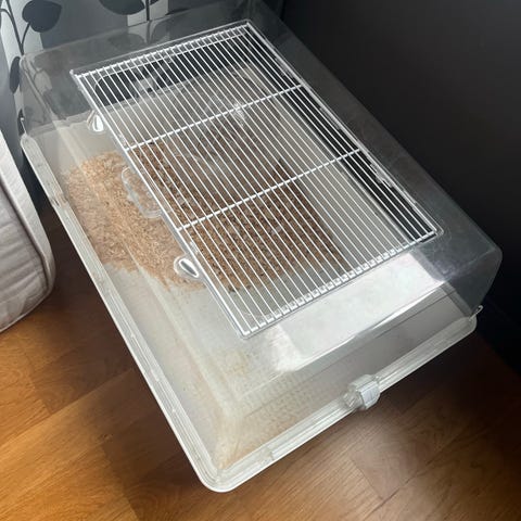 Smådyrbur i plast med oransje bunn og gjennomsiktig topp. Buret har metallgitter på toppen med åpning for enkel tilgang. Inne i buret følger det med hjul, matskål og drikkeflaskeholder. Egnet for små kjæledyr som for eksempel hamster eller andre små gnagere. Passer til innendørs bruk.