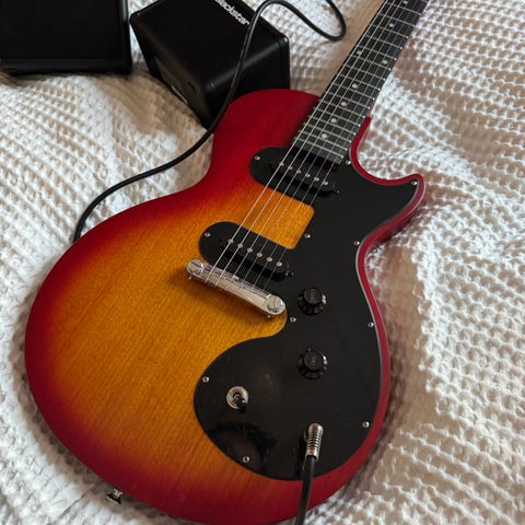 Det følger med en Cort CM10G gitarforsterker i kompakt størrelse. Forsterkeren har flere kontroller på frontpanelet, blant annet volum, tone/EQ og overdrive-funksjon, samt inngang for gitar. Dette oppsettet passer til øving hjemme eller i mindre rom der man trenger en enkel elektrisk gitar med tilhørende forsterker.