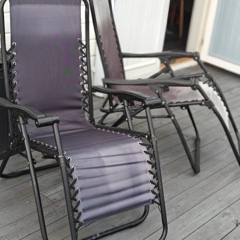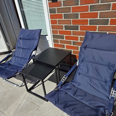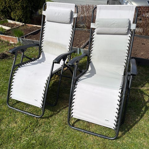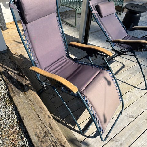 Solstoler er bleket av solen selges med sidebord som festes på stol med koppeholder