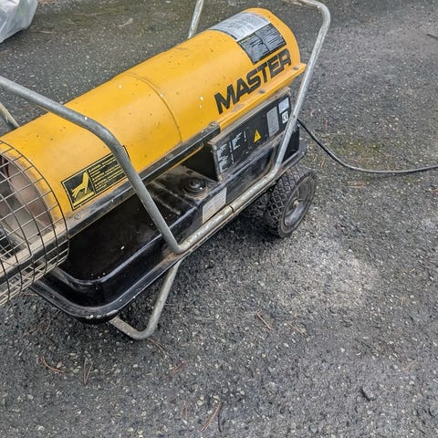 Anslut diesel varmluftsaggregat med effekt på 30 kW. Enheten drives på diesel og er utformet som et mobilt varmeaggregat med hjul og håndtak for enkel forflytning. Farge svart med gule detaljer.