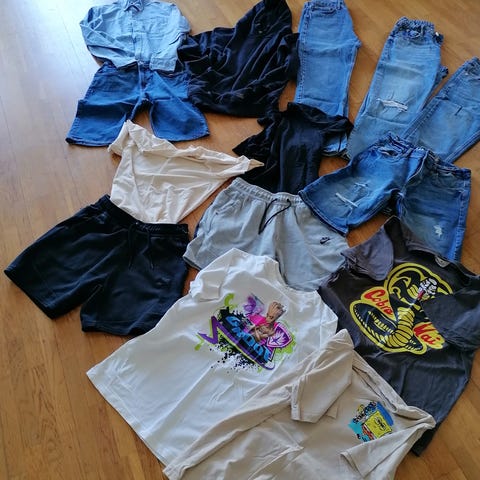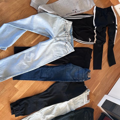 H&M barneklær pakke flerfarget str. 164 og noe i XS/ S Pakken inneholder ulike plagg som overdeler, bukser og gensere i forskjellige farger og mønstre. Klærne er beregnet på barn i størrelse 164 og passer gutter Flere av plaggene har trykk og logoer, og det er en blanding av hverdagsklær som t-skjorter, hettegensere, joggebukser og jeans. Materialene varierer mellom bomull og andre tekstilblandinger egnet til daglig bruk.