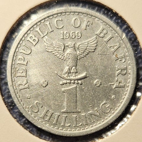 Selger en meget pen 1 Shilling fra Biafra, preget i 1969 under den nigerianske borgerkrigen.