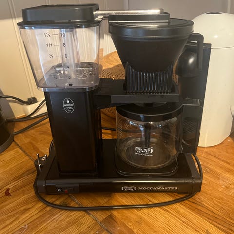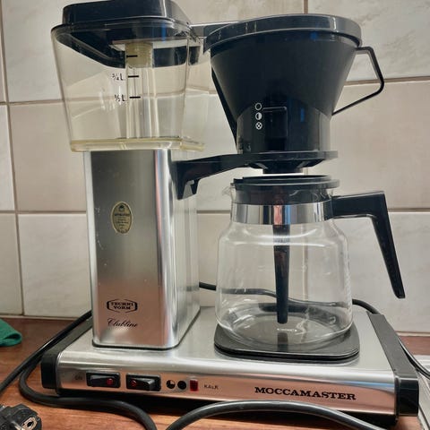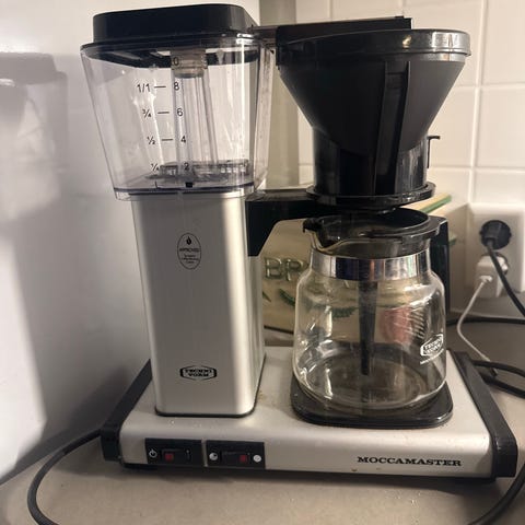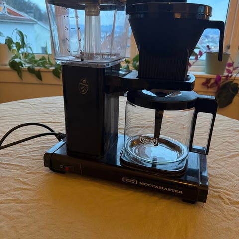 2 år gammel Moccamaster kaffetrakter med glasskanne i svart utførelse. Trakteren har vannbeholder med nivåmerking og filterholder plassert over glasskannen. På fronten finnes separate brytere for strøm og varmeplate. Egnet for traktering av filterkaffe i hjem eller på kontor, med standard størrelse glasskanne og dryppstopp fra filterholderen.Trakteren slår seg av automatisk etter 40 minutter.