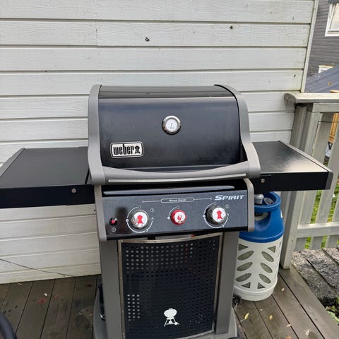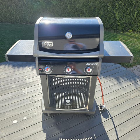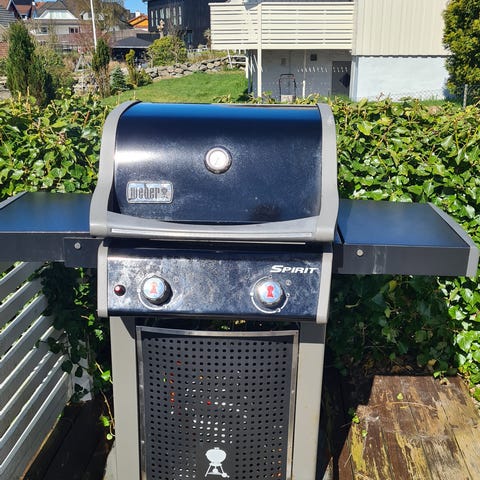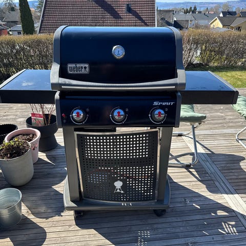 Selger en godt brukt Weber Spirit E-210. Har fungert helt fint i alle år og selges pga. overgang til større grill. Som bildene viser bærer den preg av alder og har en del rust på grillrister samt chassis. Har også en skjevhet i chassis etter en velt i stormen. Selges som den er.