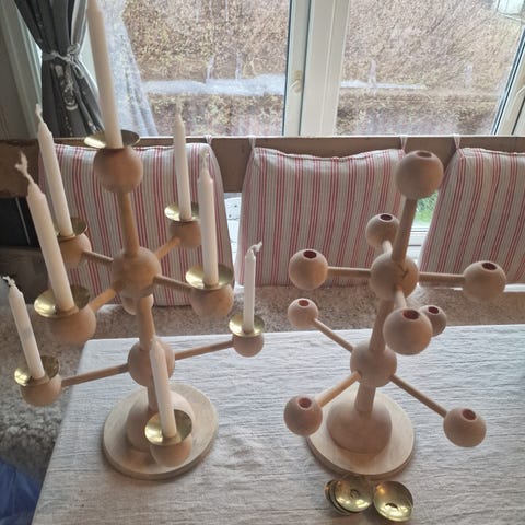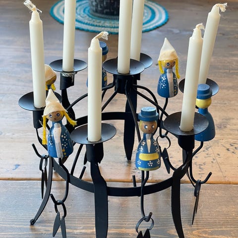 Selger en tradisjonell svensk Toarpskrona, en dekorativ lysestake i smijern med utskiftbare trefigurer og kranser i svenske farger.