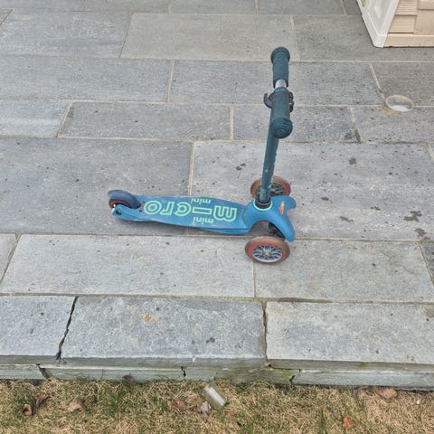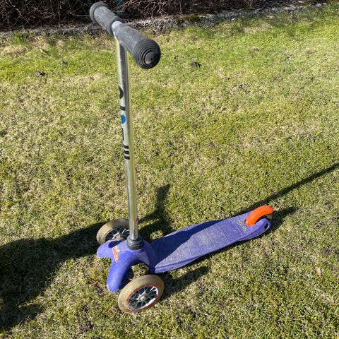 Kruzzel sparkesykkel med tre hjul (to foran og ett bak for økt stabilitet) og justerbar styrehøyde. En stabil sparkesykkel til bruk på jevnt underlag som terrasse eller asfalt. Nen bruksmerker men alt fungerer som det skal. Hentes på Ryen.