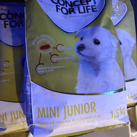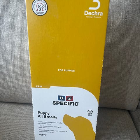 Eukanuba Puppy hundefôr i stor sekk, sammen med to metallskåler i holder og en formet fôr- og vannmatte i plast/gummi.