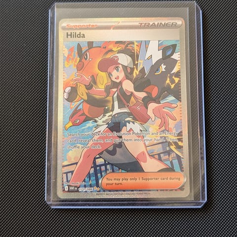Pokémon Hilda samlekort. Kortet viser figuren Hilda fra Pokémon-serien og leveres i plastlomme/beskyttelse slik det fremgår av bildene. Egnet som samlekort for Pokémon-kortsamling eller bytting med andre samlere.