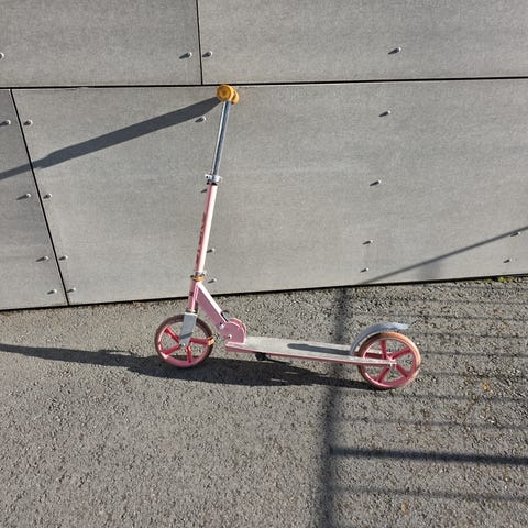 Sparkesykkel til barn i rosa og turkis farge. Modellen har justerbart styre i metall, to hjul og fotbrems bak.