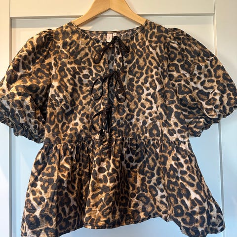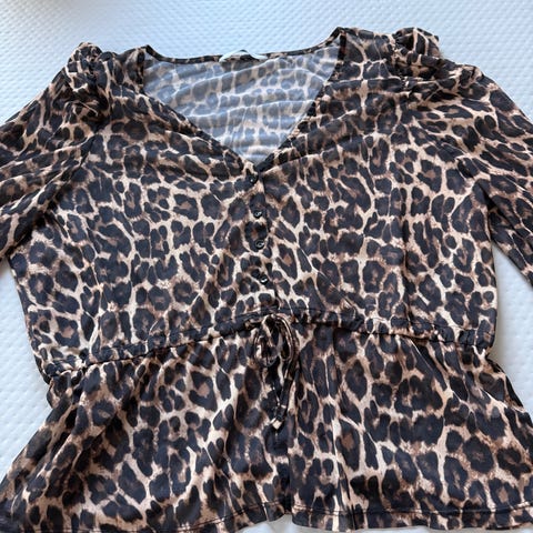 Selger ein leopardmønstret topp fra Sisters Point i størrelse M. Modellen har lange, voluminøse ermer og elastisk smock-felt i livet og overdel, som gir en tettsittende passform i kroppen og mer vidde i ermene.