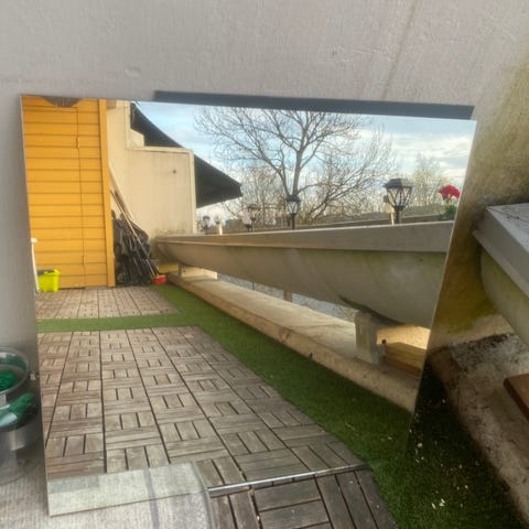 Rektangulært speil med grå ramme. Speilet har en enkel, glatt kant rundt speilflaten og festeanordning på baksiden for oppheng på vegg. Speilet har også lys over.