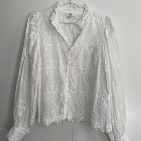 Mango bluse for dame i størrelse L. Blusen er hvit og laget i bomull. Den har lange ermer med mansjetter, rund hals og knappelukking m hemper foran. Stoffet har brodert blomsterstruktur og lett utsvingt peplum-fasong nederst. Passer til hverdagsbruk og enklere penere anledninger. Kun brukt ett par ganger.