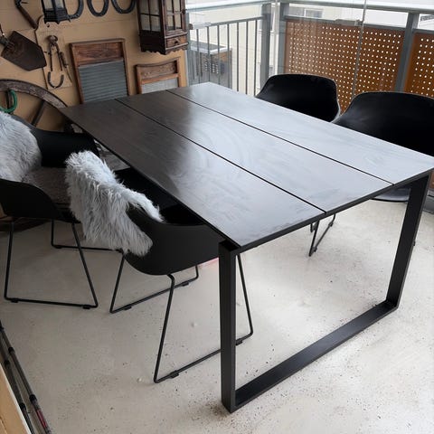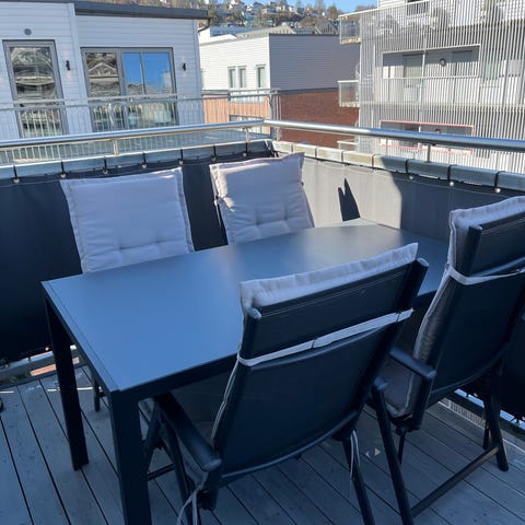 Spisegruppe for utebruk med rektangulært hagebord og tilhørende stoler i svart farge. Bordet har plate i hardt materiale som egner seg for terrasse eller balkong. Stolene har armlener og er tilpasset bruk utendørs. Passer som spiseplass på veranda, terrasse eller i hage.
