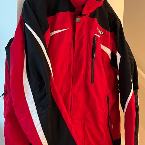 Goldtest skijakke i rød og hvit farge med flere kontrastfelt og trykte logoer. Jakken har høy krage og glidelås i front, samt flere glidelåslommer foran. Egnet som ytterjakke til ski og annen vinteraktivitet. Armer kan taes av så det blir vest Størrelse 2xl. Kan hentes på Sjusjøen i påsken fram til langfredag over påske Bjørkelangen (kan sendes mot frakt )