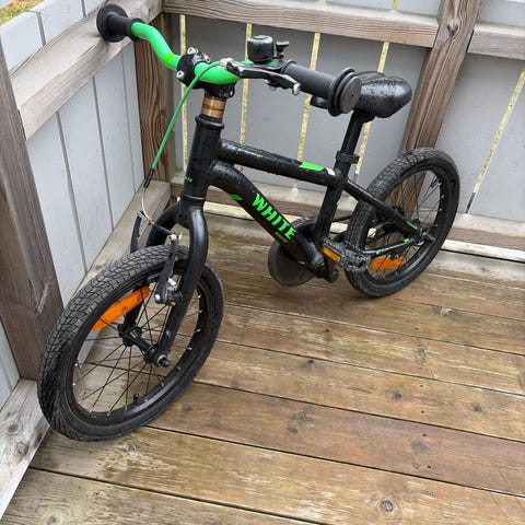 Barnesykkel med 16" hjul i blå og oransje farge. Sykkelen har rett styre, felgbremser foran og bak, samt kjedekasse. Passer til barn som bruker 16" hjulstørrelse, typisk til bruk på asfalt og jevnt underlag. Sete og styre kan vanligvis justeres noe i høyden for å tilpasses barnet.