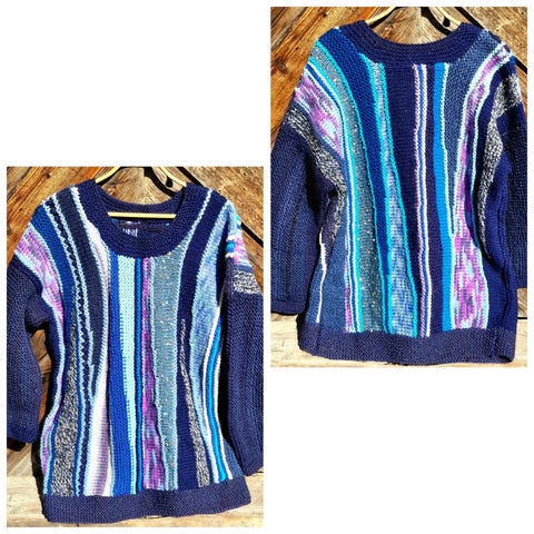 Genser strikket etter mønster Storm Sweater av Petite Knit. Strikket for noen år tilbake, så hukser ikke nøyaktig hvilket garn som er brukt, men tror det er Peer Gynt av Sandnes Garn.