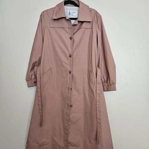Vår/høst kåpe/jakke i falsk skinn. Pen gammelrosa fargen - den er lysere i virkeligheten enn på bildet. Litt stor i størrelse, passer st. M, lengden er ca 92 cm