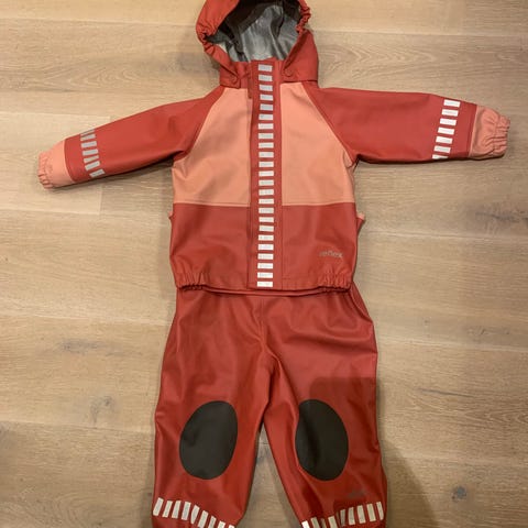 Regntøysett med regnjakke og regnbukse for barn i størrelse 98. Nøytrale farger som passer begge kjønn.
