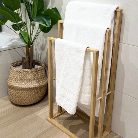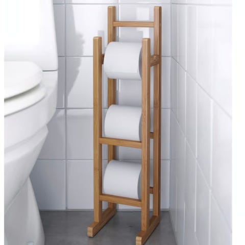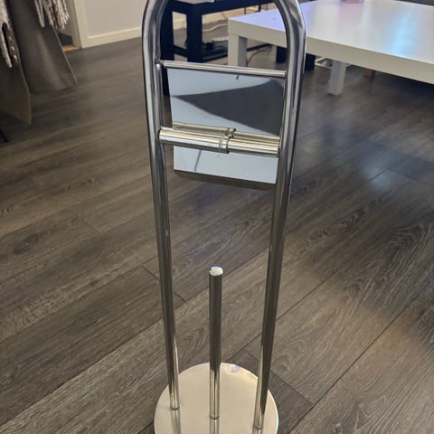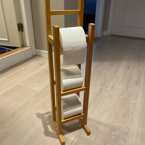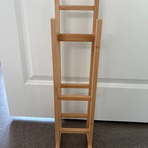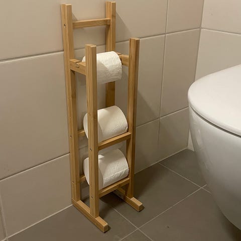 Frittstående toalettrullholder i tre. Stativet er utformet for oppbevaring av flere toalettruller vertikalt. Egnet for plassering på baderomsgulv ved siden av toalettet. Nøytral, naturfarget utførelse som passer inn på de fleste bad.