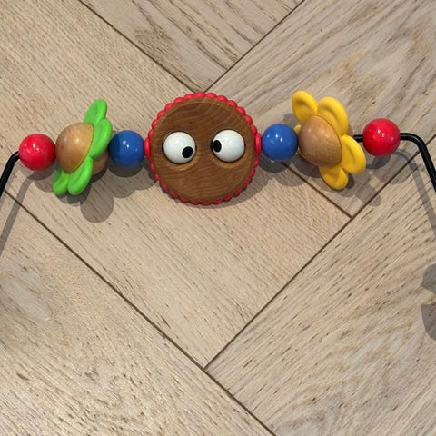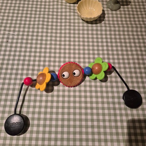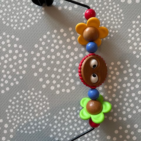 Baby Björn vippestol. Leken festes på sidene av vippestolen med klips og har flere figurer og elementer barnet kan se på og gripe etter.
