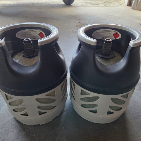 Gassflaske i komposittmateriale i grå og hvit utførelse.