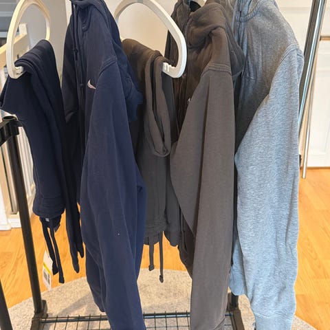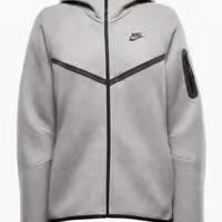 Nike hettejakke for dame i størrelse M. Jakken er grå med hel glidelås foran og justerbar hette. Den har Nike-logo på brystet og lange ermer med ribbekanter. Passer til hverdagsbruk og lett trening.