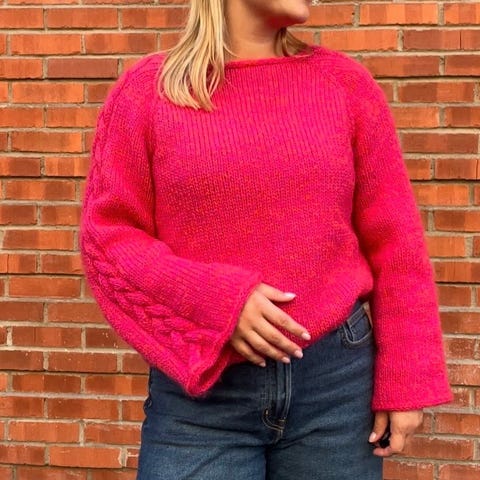 Strikkegenser for dame med høy hals i rød farge. Genseren har strukturstrikkede ermer med voluminøs fasong og ribbestrikk nederst på ermer og bol.