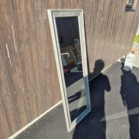 IKEA speil med dekorativ ramme i rektangulær form. Speilet har en sølvfarget ramme med mønstret overflate. Det er beregnet for veggmontering og passer for bruk i for eksempel gang, soverom eller garderobe. Baksiden har opphengsfester for montering på vegg. Egnet som helfigurspeil avhengig av plassering og høyde på veggen.